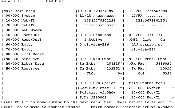You can access the MAX configuration menus in a VT100 emulation window from a computer or palmtop-controller connected to the control port as described in Starting up the MAX. When you establish the VT100 console session, the Main Edit Menu and eight status window appear. You can also establish a console session from any Telnet workstation by opening a Telnet session with the MAX. In a Telnet session you can perform all of the configuration, diagnostic, management, and other functions that could be performed from a computer connected to the MAX control port. In either case, access is controlled by Security profiles, as described in Security profiles for related information.