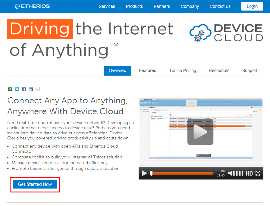 To create your free account on Device Cloud US, navigate to www.etherios.com/devicecloud and click the Get Started Now button (highlighted in the image below), then follow the steps for creating your account.