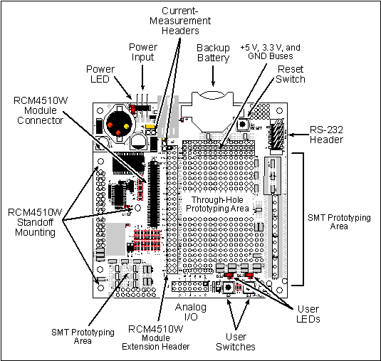 The Prototyping Board is actually both a demonstration board and a prototyping board. As a demonstration board, it can be used to demonstrate the functionality of the RCM4510W right out of the box without any modifications to either board.