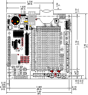 NOTE All measurements are in inches followed by millimeters enclosed in parentheses. All dimensions have a manufacturing tolerance of ±0.01" (0.25 mm). Table B-1 lists the electrical, mechanical, and environmental specifications for the Prototyping Board.