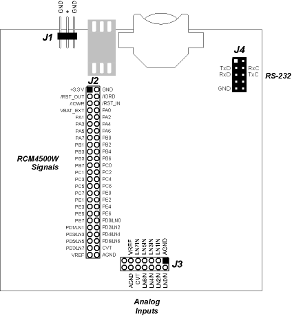 Although analog signals are shown for labeled points at header location J3 on the Prototyping Board, the analog signals on the RCM4510W are associated with the XBee RF module. These analog signals are not brought out to the Prototyping Board.