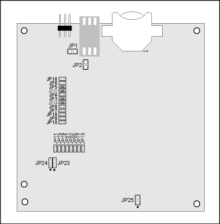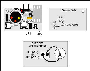 - Current Measurement OptionYou may cut the trace below header JP1 on the bottom side of the Prototyping Board and install a 1 × 2 header strip from the Development Kit to allow you to use an ammeter across the pins to measure the current drawn from the +5 V supply. Similarly, you may cut the trace below header JP2 on the bottom side of the Prototyping Board and install a 1 × 2 header strip from the Development Kit to allow you to use an ammeter across the pins to measure the current drawn from the +3.3 V supply.