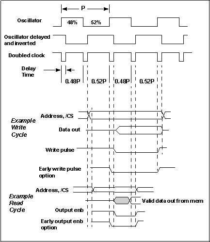 The doubled clock-low time is subject to wide (50%) variation since it depends on process parameters, temperature, and voltage. The times given above are for a supply voltage of 5 V and a temperature of 25°C. The doubled clock-low time increases by 20% when the voltage is reduced to 4 V, and increases by about 40% when the voltage is reduced further to 3.3 V. The values increase or decrease by 1% for each 5°C increase or decrease in temperature. The doubled clock is created by xor'ing the delayed and inverted clock with itself. If the original clock does not have a 50-50 duty cycle, then alternate clocks will have a slightly different length. Since the duty cycle of the built-in oscillator can be as asymmetric as 52-48, the clock generated by the clock doubler will exhibit up to a 4% variation in period on alternate clocks. This does not affect the no-wait states memory access time since two adjacent clocks are always used. However, the maximum allowed clock speed must be reduced by 10% if the clock is supplied via the clock doubler. The only signals clocked on the falling edge of the clock are the memory and I/O write pulses, and these have noncritical timing. Thus the length of the clock low time is noncritical as long as it is not so long as to shorten the clock high time excessively, which could make the write pulse too short for the memory used. This is unlikely to happen with practical clock speeds and typical static RAM memories.