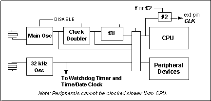 The on-chip routing of the clocks is shown in Figure 7-1. The main oscillator can be doubled in frequency and/or divided by 8. If both doubling and dividing are enabled, then there will be a net division by 4. The CPU clock can optionally by divided by 2 and then optionally drive the external pin CLK. In many cases the clock is not needed externally, and in that case CLK can be used as a general-purpose output pin. The divide-by-2 option is available to minimize electromagnetic radiation if the is clock is driven off chip.