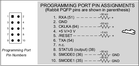 The programming port provides a standard physical and electrical interface between a Rabbit-based system and the Dynamic C programming platform. A special interface cable and converter connects a PC serial port to the programming port. The programming port is implemented by means of a 10-pin standard 2 mm connector. (Of course the user can change the physical implementation of the connector if he so desires.) With this setup the PC can communicate with the target, reset it and reboot it. The DTR line on the PC serial interface is used to drive the target reset line, which should be drivable by an external CMOS driver. The STATUS pin is used to by the Rabbit-based target to request attention when a breakpoint is encountered in the target under test. The SMODE pins are pulled up by a +5 V/+3 V level from the interface. They should be pulled down on the board when the interface is not in use by approximately 5 kW resistors to ground. The target under test provides the +5 V or +3 V to the interface cable which is used to power the RS-232 driver and receiver.