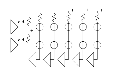 The parallel port D outputs can be individually programmed to be open drain. This is useful for scanning a switch matrix, as shown in Figure4-2. A row is driven low, then the columns are scanned for a low input line, which indicates a key is closed. This is repeated for each row. The advantage of using open-drain outputs is that if two keys in the same column are depressed, there will not be a fight between a driver driving the line high and another driver driving it low.