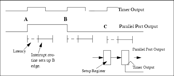 The timer output in Figure 4-1 is periodic. As long as the interrupt routine can be completed during one timer period, an arbitrary pattern of synchronous pulses can be output from the parallel port.