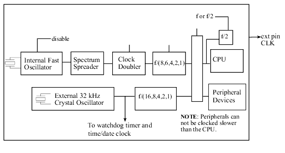 - The main crystal oscillator may be divided by 2, 4, 6 or 8.
