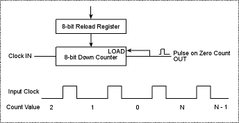 The Timer A peripheral consists of ten separate eight-bit countdown timers, A1A10. Each counter counts down from a programmed time constant, which is automatically reloaded into the respective counter when the count reaches zero. For example, if the reload register contains 127, then 128 pulses enter on the left before a pulse exits on the right (see Figure 13-1). If the reload register contains zero, then each pulse on the left results in a pulse on the right, that is, there is division by one. The reload register can contain any number in the range from 0 to 255. The counter divides by (n + 1).