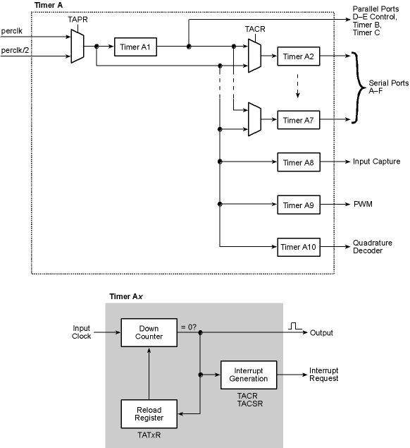 For Timers A1A7 the terminal count condition is reported in a status register and can be programmed to generate an interrupt. Six of these seven timers (A2A7) have the option of being cascaded from Timer A1, but the primary clock for all of the timers is the peripheral clock either directly or divided by 2 (the default). The output pulses are always one clock wide. Clocking of the timers takes place on the negative edge of this pulse. When the counter reaches zero, the reload register is loaded into the counter on the next input pulse instead of a count being performed.
