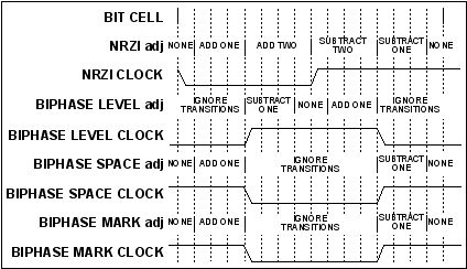 With NRZ and NRZI encoding, all transitions occur on bit-cell boundaries and the data should be sampled in the middle of the bit cell. If a transition occurs after the expected bit-cell boundary (but before the midpoint), the DPLL needs to lengthen the count to line up the bit-cell boundaries. This corresponds to the "add one" and "add two" regions shown. If a transition occurs before the bit-cell boundary (but after the midpoint), the DPLL needs to shorten the count to line up the bit-cell boundaries. This corresponds to the "subtract one" and "subtract two" regions shown. The DPLL makes no adjustment if the bit-cell boundaries are lined up within one count of the divide-by-16 counter. The regions that adjust the count by two allow the DPLL to synchronize faster to the data stream when starting up.