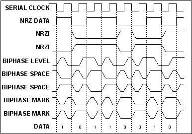 Several types of data encoding are available in the HDLC mode. In addition to the normal NRZ, they are NRZI, biphase-level (Manchester), biphase-space (FM0), and biphase-mark (FM1). Examples of these encodings are shown below. Note that the signal level does not convey information in NRZI, biphase-space, and biphase-mark. Instead it is the placement of the transitions that determine the data. In biphase-level it is the polarity of the transition that determines the data.