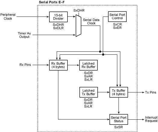 The transmit and receive buffers of Serial Ports E and F have 4 bytes each; this reduces the interrupt overhead requirements. A serial port interrupt is generated whenever at least one byte is available in the receive buffer or whenever a byte is shifted out of the transmit buffer. The byte is available in the buffer after the final bit is sampled.