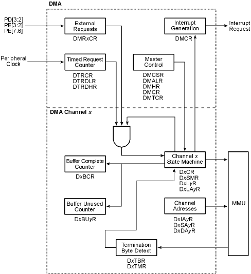 External DMA Request 0 can be enabled from pins PD2, PE2, or PE6. External DMA Request 1 can be enabled from pins PD3, PE3, or PE7.