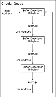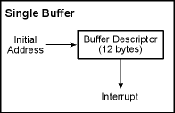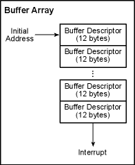 In this mode, an array of 12-byte descriptors is set up adjacent in memory; only the last buffer is set to halt on completion. The last buffer is also typically set to interrupt on completion, but other buffer descriptors in the array can also generate interrupts.