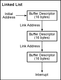 A linked list is similar to a buffer array, except that 16-byte descriptors are used and the descriptors are not necessarily adjacent in memory. The advantage of this mode is the ability to spread descriptors.