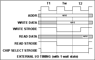 On startup, the I/O strobes are set as chip selects with 15 wait states, read-only, active-low signaling, and will use the auxiliary I/O bus. These settings will be used for the dedicated I/O strobe pins /IORD, /IOWR, and /BUFEN whenever an external I/O write occurs even if not I/O strobe signals are being output on parallel port pins.