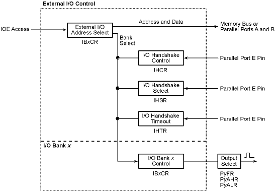 In addition, a handshaking signal input can be enabled on a Parallel Port E pin, and used to pause an external I/O transaction until the external device is ready to complete the transaction. A timeout period can be defined to ensure that the processor is not held indefinitely by a misbehaving external device.