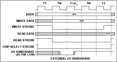 The I/O handshake signal is sampled at the end of the first wait state (Tw). When the handshake signal is disabled, the transition will start at the beginning of the Tw phase and continue to completion.
